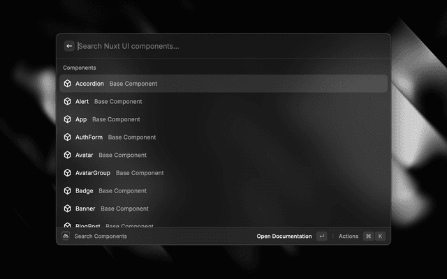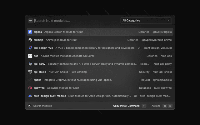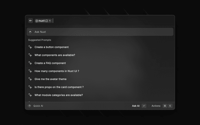 • Direct Shortcuts: Access Nuxt docs, components, and modules search