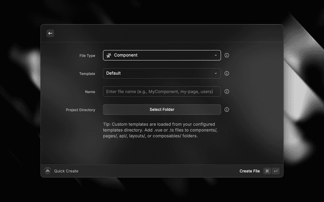 • Create files instantly (Component, Page, API Route, Composable)