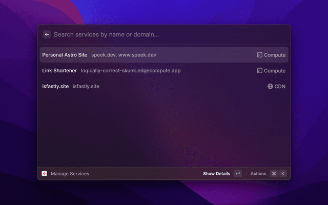 Manage services serves as a list of all your delivery and compute services, allowing you to search name or domain. From the list view, you can hit to see service details, ⌘+⏎ opens the service in the Fastly Control Panel, ⌘+⇪+P runs a purge all on that service, and ⌘+⇪+R opens the real-time stats dashboard, while ⌘+⇪+L opens the logs.