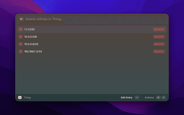 Quickly block IPs and manage access control lists for security response. Search across all ACLs by service or name, then to view entries. Use ⌘+N to rapidly add IPs during security incidents, with support for CIDR blocks and bulk imports. Each entry shows whether it allows or blocks traffic, with ⌘+E to edit and ⌘+⌫ to remove entries.
