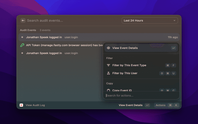 This extension allows to search your Fastly services and data stores, invite team members, create CDN services, get quick access to resources, the audit log, and more.