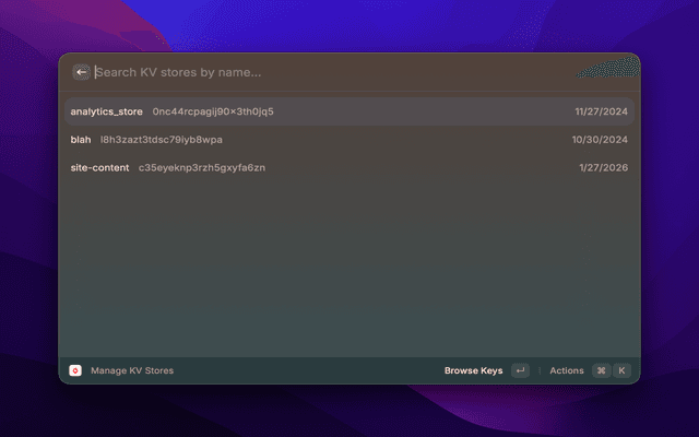 Access and manage all your Fastly data stores in one place. Browse KV Stores, Config Stores, and Secret Stores with full CRUD operations. From any store list, you can to view entries, ⌘+N to create new items, and ⌘+K to access quick actions like export.