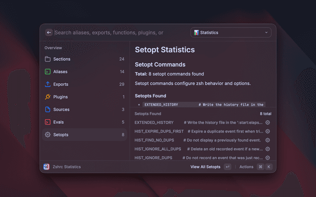| 📝 | Section Management | View zshrc content organized by logical sections with detailed breakdowns |
