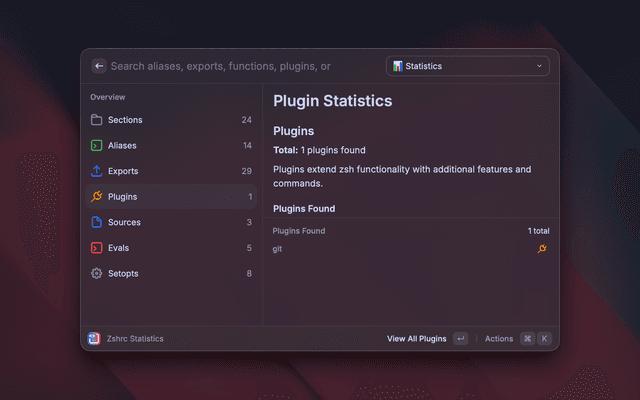 | 📊 | Statistics & Overview | Comprehensive statistics of your zshrc configuration with counts of aliases, exports, functions, plugins, and more |