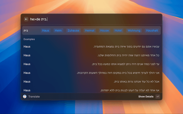 • home will translate "home" from default source language to default target language. (Auto reverse direction if enabled)