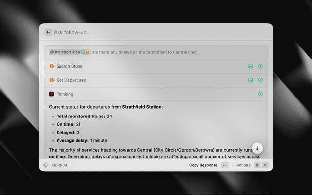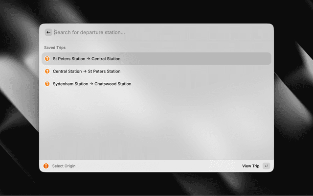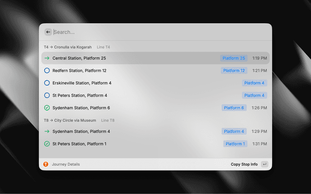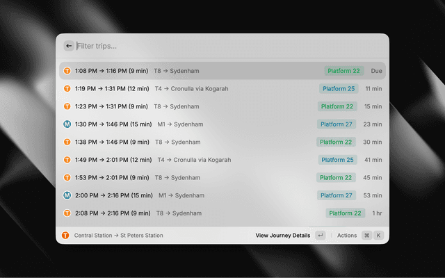 Plan trips and view real-time departures for Sydney trains, metro, and light rail directly from Raycast.