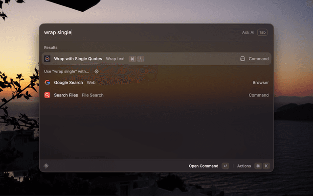 Assign a Raycast hotkey to each command for instant, keyboard-only wrapping — no need to open the Raycast bar at all.