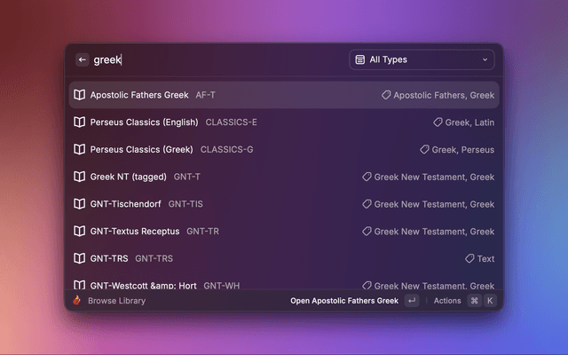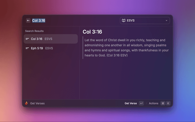 • Search Bar Input: Type scripture references directly in the Raycast search bar (e.g., "John 3:16")