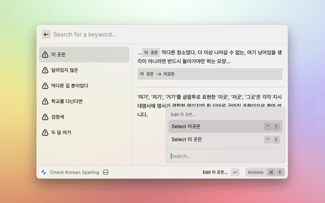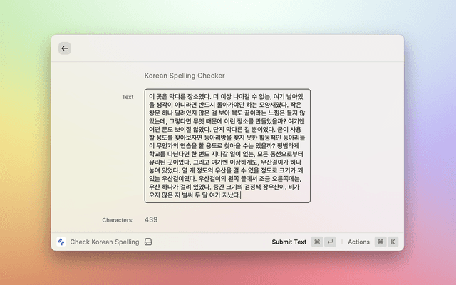 This is a raycast extension with a command to check spelling/grammar errors in your Korean text.