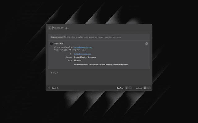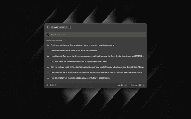 Boost your email workflow with powerful contextual Superhuman integration. Draft emails with context and search your inbox using Superhuman's advanced operators - all without leaving flow.