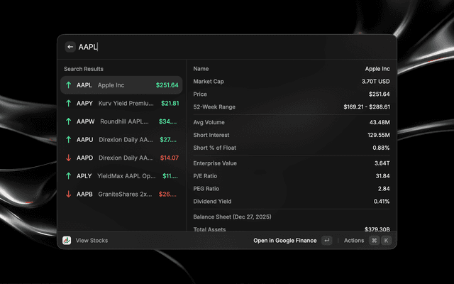 Look up stock prices from Google Finance directly in Raycast.