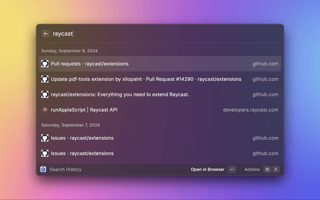 Raycast AIRaycast NotesRaycast FocusClipboard HistoryWindow ManagementSnippetsFile SearchQuicklinksCalculatorCalendarSystemEmoji Picker