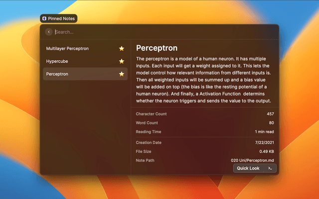 This command will open a list of your bookmarked notes. All actions and preferences from the Search Note command are available. Bookmarking or unbookmarking a note will reflect in Obsidians Bookmarked notes. Bookmarking a note in Obsidian will also reflect in Raycast.