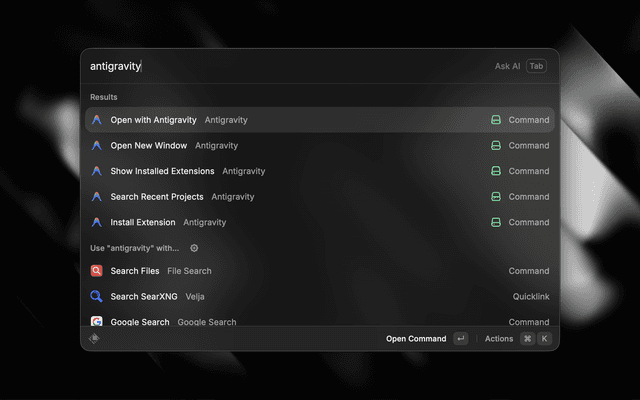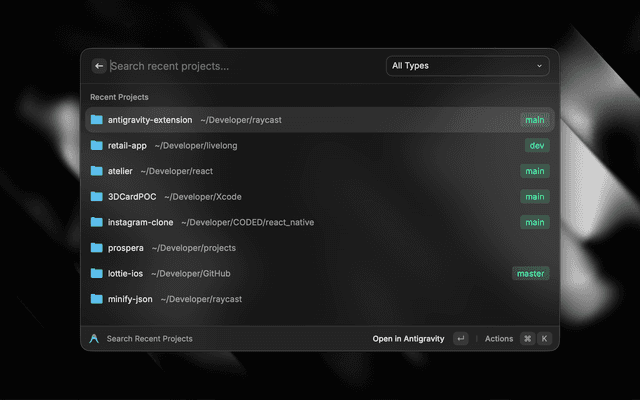 Control Antigravity directly from Raycast - Search and open recent projects, handle extensions and commands.