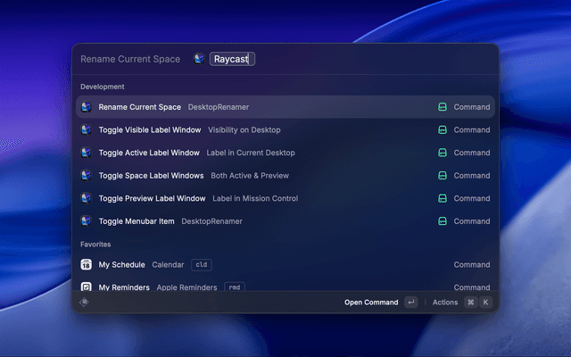 Control gitmichaelqiu's DesktopRenamer, an app that lets you rename and switch your macOS desktops, from Raycast.