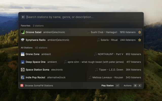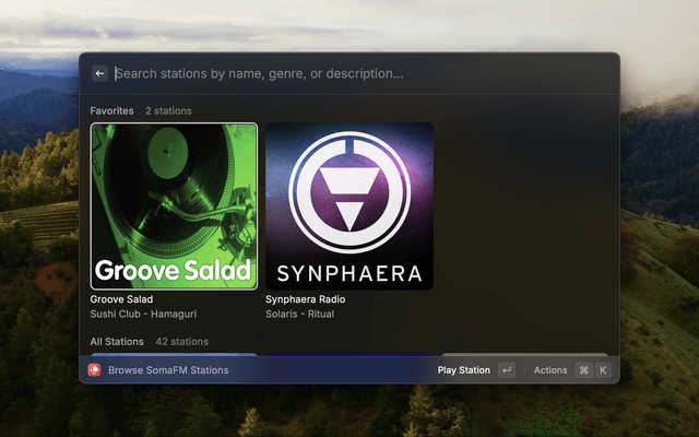 Browse and play SomaFM internet radio stations directly from Raycast.