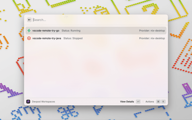 Manage your DevPod workspaces directly from Raycast. This extension allows you to list, start, stop, and delete DevPod workspaces without leaving your keyboard.