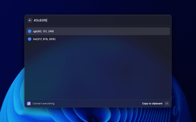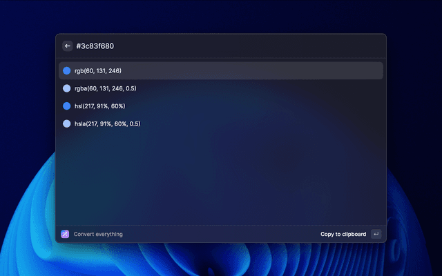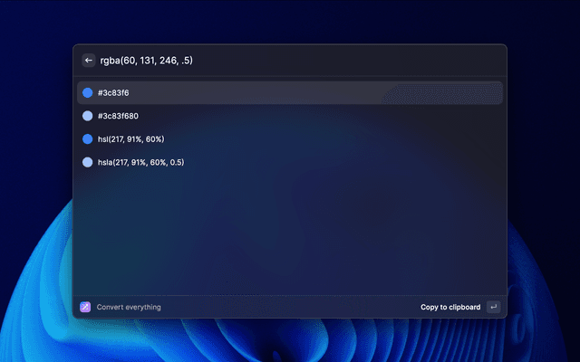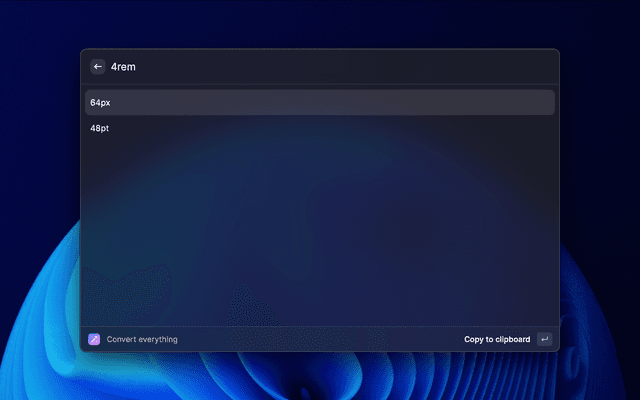 Converts everything web related: rem, px, pt, hex, hex (with opacity), rgb, rgba, hsl, hsla, oklch and shows the closest Tailwind CSS color.
