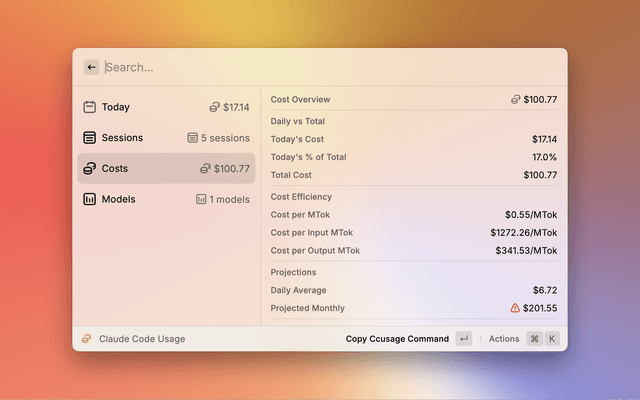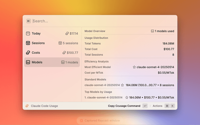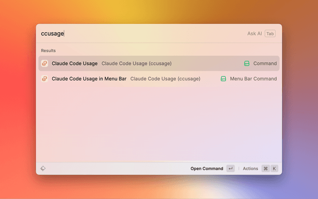A Raycast extension that provides real-time monitoring of Claude Code usage statistics using the ccusage CLI tool.
