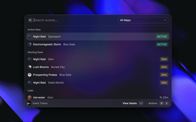 Event TimersView active/upcoming events sorted by time, filterable by map