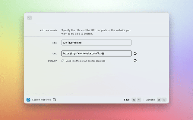 2. Enter the site's template URL. This is a URL whose search query is replaced with curly braces, e.g., https://website.com/?q={}. The curly braces indicate where your search query goes; when run, {} will be replaced with your (URL-encoded) search term.