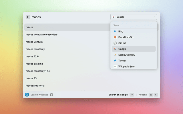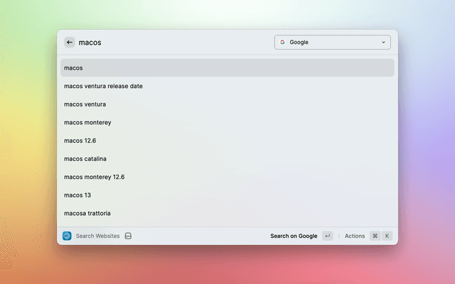 While entering a query, suggestions can be shown for your query, the same as you'd see in a search engine in your browser. This setting controls the search engine to get suggestions from: DuckDuckGo (the default), Google, or "None" if you don't want any search suggestions.