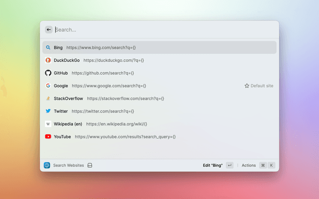For instance, to add an entry that uses Google, you'd use the template URL https://www.google.com/search?q={}. If you enter the search "my search terms", then the URL that is opened in your browser will be https://www.google.com/search?q=my%20search%terms.