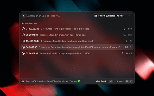 A Raycast extension to quickly search for IP addresses across all your Google Cloud Platform projects.