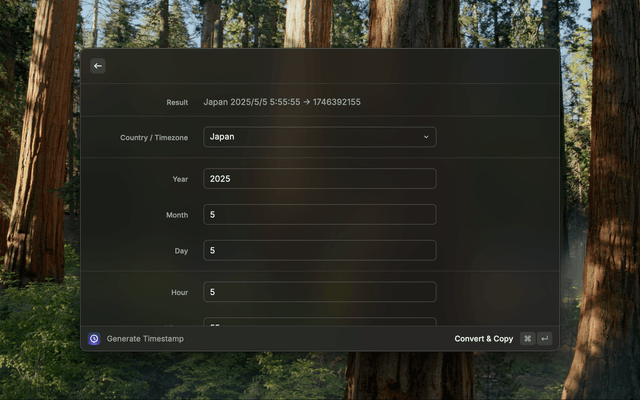 • Enter year, month, day, hour, minute, second, and select a country (time zone). The extension will generate a Unix timestamp as if the entered date and time are in the selected country's local time. Example: If you select "Japan", the input is treated as Japan Standard Time (UTC+9).