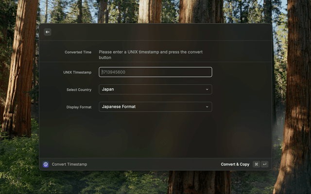 A Raycast extension to convert between Unix timestamps and human-readable date and time formats. Supports multiple time zones and display formats, including Japan, United States, Korea, and Thailand.