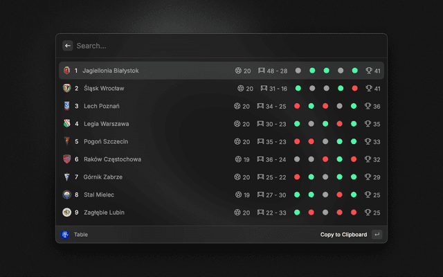 This extension allows keeping track of the standings of Ekstraklasa, which is polish football league 🇵🇱