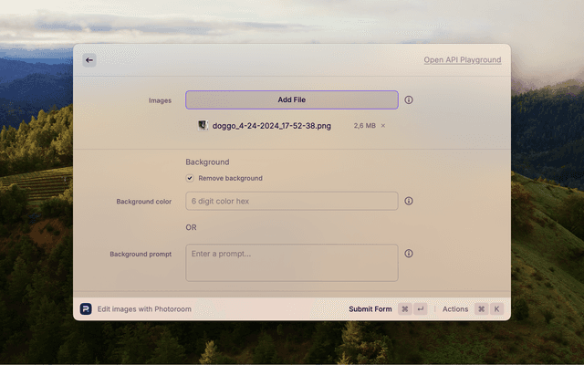 Please note, that the extension uses the Image Editing v2 API and needs a Photoroom API key which can be requested here: https://app.photoroom.com/api-dashboard