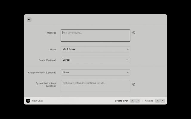 • Create Project: Creates a new v0 project with an optional description, icon, environment variables, and instructions. Projects help organize chats and manage context.