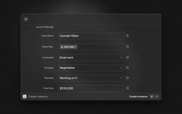 The Create Instance command allows you to create new instances by selecting an entity and filling in the relevant information.