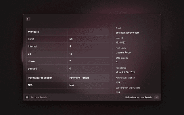 Follow instructions from https://uptimerobot.com/api/#auth to get the KeyCopy and Paste this in PreferencesThe Free Plan is limited to 10 req/min so once data is fetched, it is stored Locally and not refreshed (refetched) until 24 hours have passed. You can easily refresh/refetch manually through the Action.