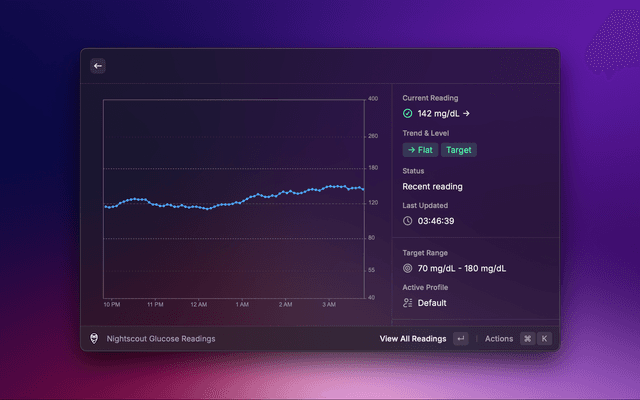 • View current glucose readings in a dedicated view, root search, or the menu bar