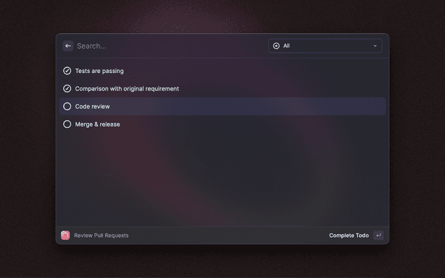 Checklist is a simple - Raycast native - app that allows you to create and work on checklists. Based on The Checklist Manifesto you know checklists can save lives and make you more productive by improving the quality of repetitive tasks. Checklist lets you create, edit and delete checklists. You can easily start working on them and keep track of the progress.